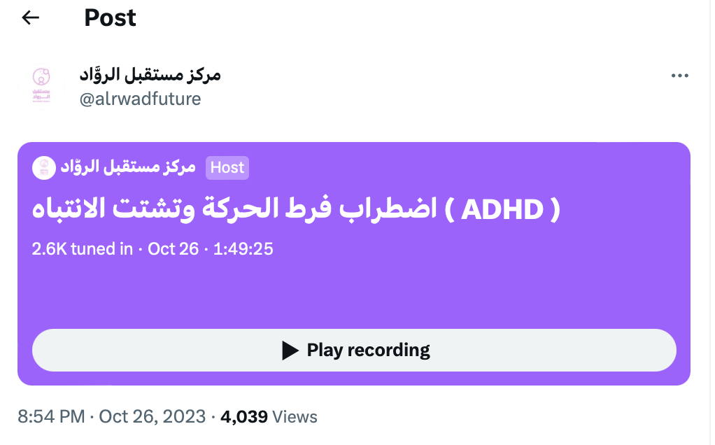 هنا تجدون حواراً عن فرط الحركة وتشتت الانتباه وبخاصة عن التدخلات العلاجية السلوكية المناسبة. الحوار كان باستضافة كريمة من مركز مستقبل الرواد بمكة المكرمة والذي يحصل فيه الأطفال ذوي الاحتياجات الخاصة على الدعم والعلاجات السلوكية. أدارت الحوار الأستاذة أبرار متولي، الأخصائية في مجال تحليل السلوك التطبيقي.ـ